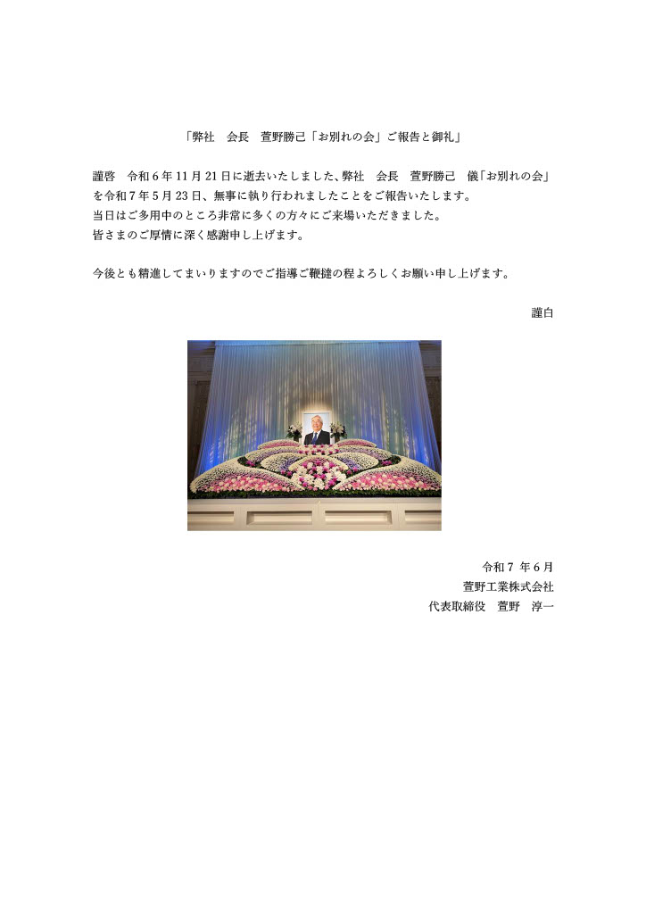 弊社 会長 萱野勝己「お別れの会」ご報告と御礼